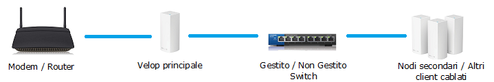Il Linksys Velop può utilizzare gli switch Managed (Gestito) e Unmanaged (Non Gestito). Gli switch non Gestiti di solito non necessitano di configurazioni regolate in quanto lo switch passa semplicemente tutto il traffico. D'altra parte, gli switch Gestiti in genere richiedono all'utente di confermare le seguenti configurazioni e apportare le modifiche, se necessario.